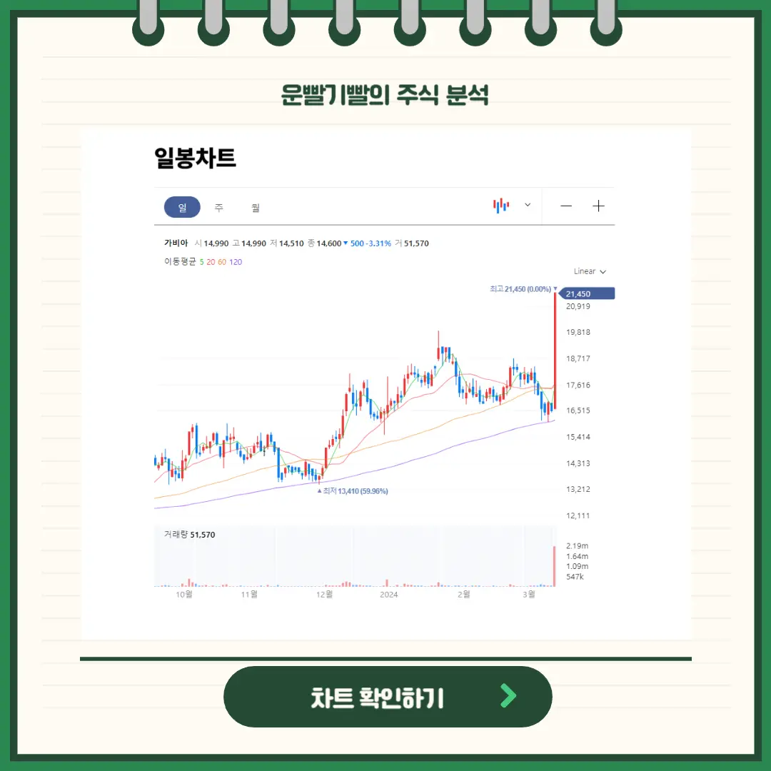 2023년 8월 18일 52주 최저가 11,080원을 형성하고 꾸준한 상승세를 보이며 2024.3월 13일 52주 최고가 21,450 돌파했습니다. 저점대비 100% 오른 종목으로 상한가가 무너지지 않으면 3월 14일 아침 시초가에 상한가에 매도하는 것도 하나의 방법이라고 보고 있습니다. 단기간에 많이 오른 종목은 항상 데드를 설정하고 종목을 매매해야 합니다.
