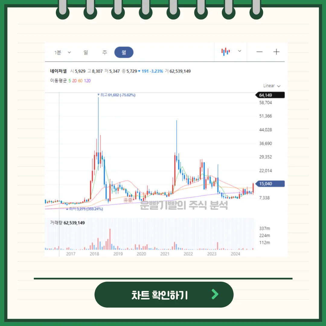 - 3차 목표가: 20,000원 장기적 목표로 설정되며, '조인트스템'의 상업화 진행과 미국 내 허가 절차의 성공적 완료, 그리고 가능한 국제 시장으로의 확장을 고려한 가격입니다. 이 목표가는 네이처셀이 글로벌 시장에서의 입지를 확립하고, 퇴행성 관절염 치료제 시장에서 중요한 역할을 하게 될 경우 달성될 수 있습니다.