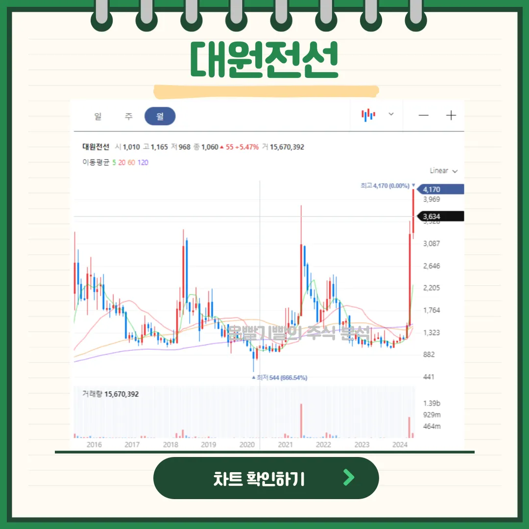 시장이 계속 호조를 보이고 회사가 전략적 계획과 시장 기회를 활용한다면, 목표가는 현재의 52주 최고가를 넘어서 4,500원에서 5,000원 사이가 될 수 있습니다. 이는 현재의 성장 추세가 지속되고 회사의 수익성과 시장 점유율이 향상될 것이라는 가정에 기반합니다. 52주 최저가 대비 400% 오른 주식입니다. 월봉으로 보면 최고가를 형성했기 때문에 대원전선 주가를 매매할 때는 항상 데드를 설정해서 매매하시기 바랍니다.