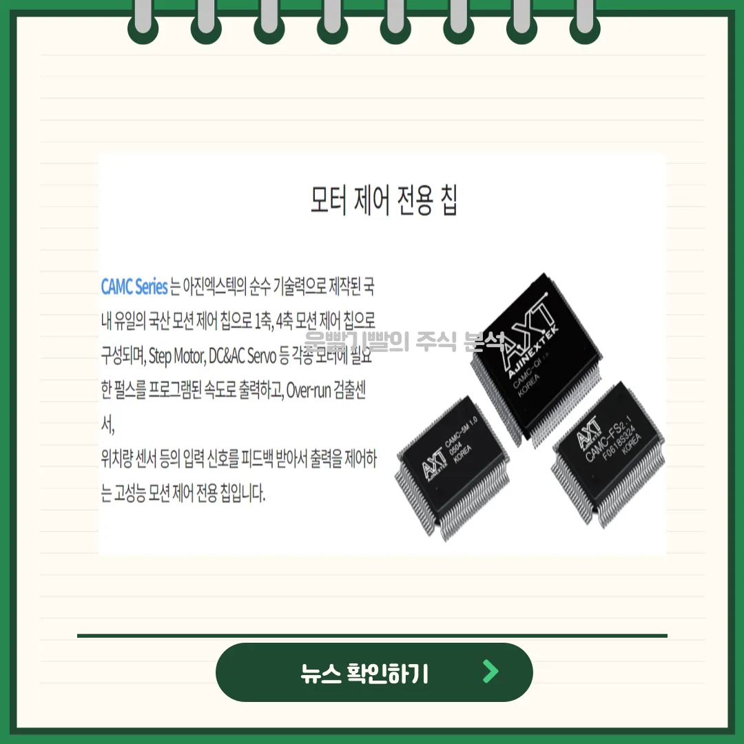 아진엑스텍은 1997년에 설립된 기업으로, 주요 사업은 반도체 장비, 스마트폰 장비, 이차전지 장비 등 제조 및 검사 자동화 장비의 제어기 생산입니다. 2013년 7월 1일에 코스닥 시장에 상장되었습니다. 아진엑스텍은 고급 모션 제어 기술 개발, 협동로봇 실증센터 구축, XR 글라스 개발 등 연구개발 활동을 활발히 진행하고 있으며, 다양한 산업 분야에서 필요한 정밀한 제어 및 자동화 솔루션을 제공하고 있습니다. 이러한 기술력과 제품 품질을 바탕으로 지속적인 성장을 이어가고 있는 기업입니다.