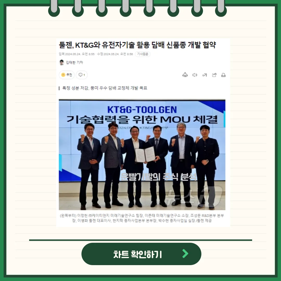 - 시장 기회와 성장 잠재력: 툴젠은 최근 KT&G와의 협약을 통해 유전자 기술을 이용한 신품종 담배 개발에 참여하고 있으며, 이는 새로운 시장을 개척할 기회를 제공합니다. 이러한 다양한 산업과의 협력은 툴젠의 시장 범위를 확장하고, 장기적인 수익 창출원을 확보하는 데 기여할 수 있습니다.