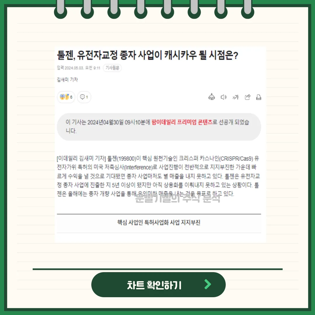 - 재무 상태와 위험 요소: 툴젠의 연속된 영업 손실과 높은 연구개발 비용은 재무적 리스크를 증가시킵니다. 그러나 기술적 성공과 특허 수익화, 효율적인 자본 운용을 통해 장기적으로는 이러한 위험을 극복할 가능성도 존재합니다.