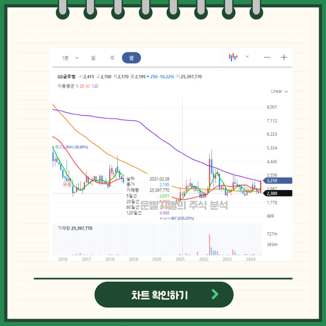 GS글로벌 주가 전망 및 목표가에 대해 이 글은 제공합니다. 특히 '대왕고래 프로젝트' 참여와 자원개발 관련주로서의 위치를 고려한 분석을 통해 1차, 2차, 3차 목표주가를 설정하였습니다. 이는 GS글로벌이 에너지 및 자원 분야에서의 성장 가능성과 장기적인 사업 전략을 바탕으로 합니다. 이 자료는 투자자들에게 GS글로벌의 잠재적 가치와 향후 주가 움직임에 대한 심층적인 통찰을 제공하고자 합니다.