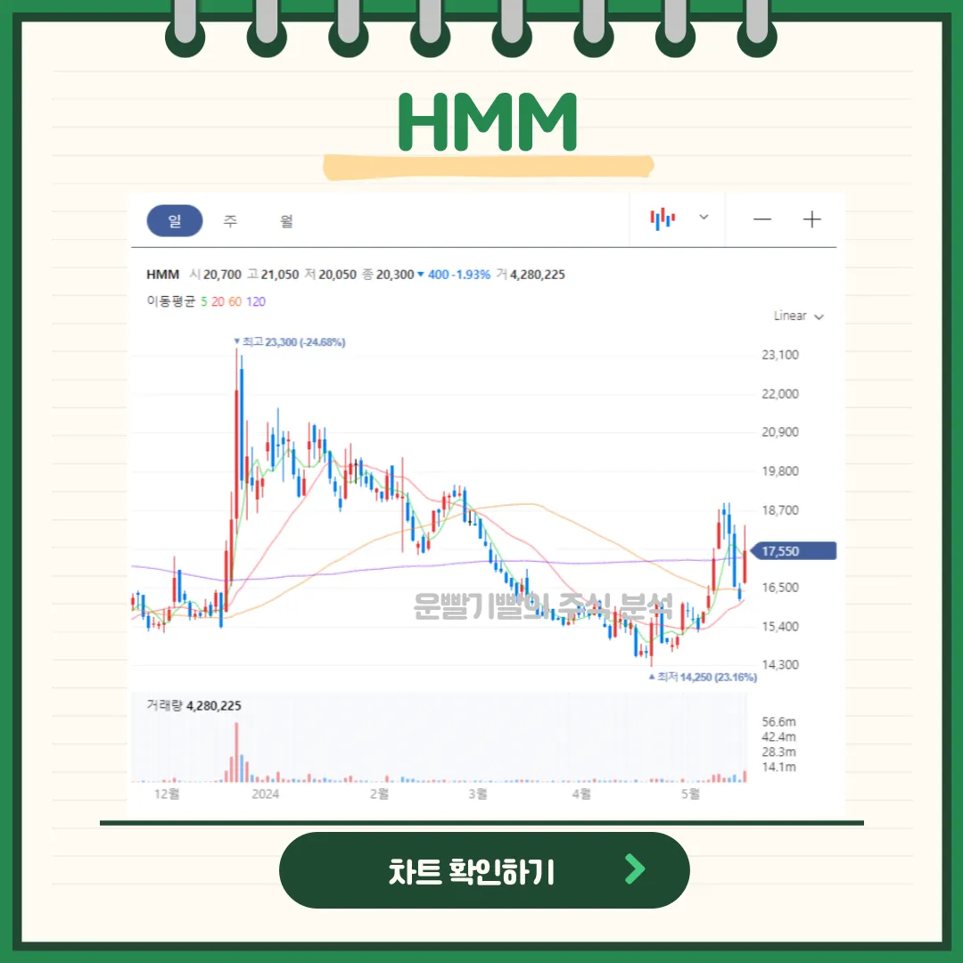 2024년 5월 20일 현재, HMM 주가는 17,550원으로 기록되었습니다. 이는 전일 대비 8.47% 상승한 수치로, 회사의 긍정적인 비즈니스 전망과 시장의 호응을 반영한 결과로 해석됩니다. HMM의 주가 흐름을 살펴보면, 지난 52주 동안 최고가는 23,300원으로 기록되었으며, 최저가는 13,620원이었습니다. 이는 HMM이 지난 1년간 겪은 시장의 변동성을 잘 보여주며, 특히 최근의 주가 상승은 회사의 재무 상태 개선, 운영 효율성 증가, 또는 전반적인 시장 상황의 호전 등 다양한 요인에 기인할 수 있습니다.