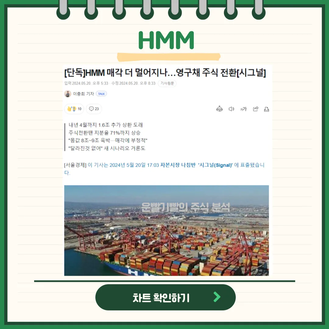 이러한 상황을 고려할 때, HMM에 투자를 고려하는 투자자는 회사의 재무 상태, 산업 동향, 주식 전환의 잠재적 영향 등을 면밀히 분석하고 신중한 접근을 해야 할 것입니다. 또한, 글로벌 해운 시장의 변동성과 장기 경영 전략에 대한 이해도가 중요하며, HMM의 경쟁력 강화 전략과 장기적인 재무 건전성 유지 여부도 중요한 평가 지표가 될 것입니다. 하지만 산업은행은 HMM을 높은 가격에 매각하기 위해서는 주가는 우상향 할 것으로 예상합니다.