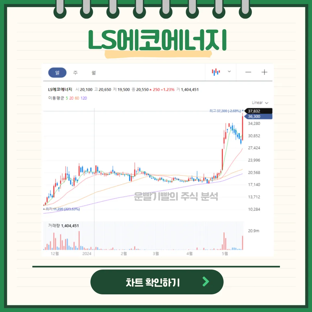 2024년 5월 20일 기준, LS에코에너지 주가는 36,300원으로, 전일 대비 26.48% 상승하였습니다. 이는 주요 이벤트나 발표가 있었음을 시사할 수 있으며, 투자자들에게 긍정적인 신호로 받아들여질 수 있습니다. 최근 52주 동안의 최고가는 37,300원으로 현재 주가가 최고가에 근접해 있음을 보여주며, 최저가는 6,600원으로, 주가는 지난 1년 간 상당한 변동성을 경험했습니다.